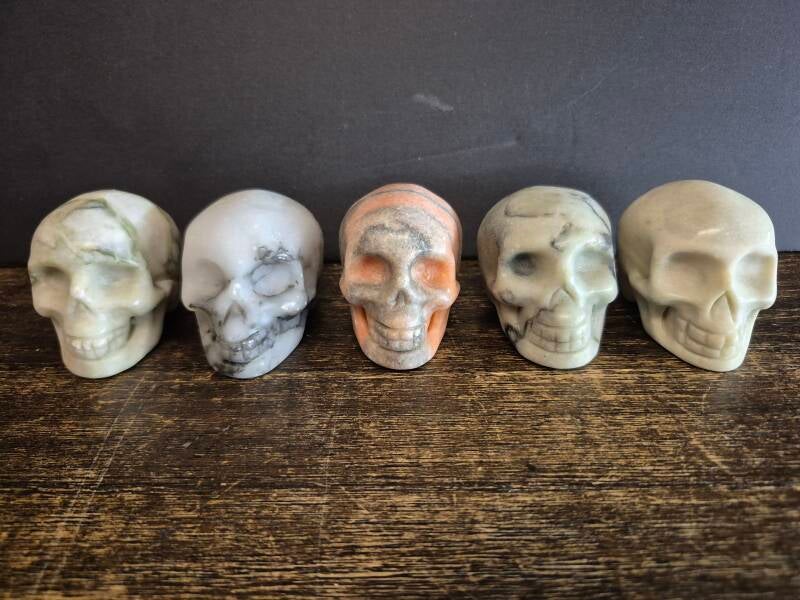 Moonstone , smelted quartz and kamababa jasper skulls left moonstone 2 1/2 inch 266 grams middle 3 1/2 inch 601 grams $400.00 right 2 3/4 inch 348 grams $30.00